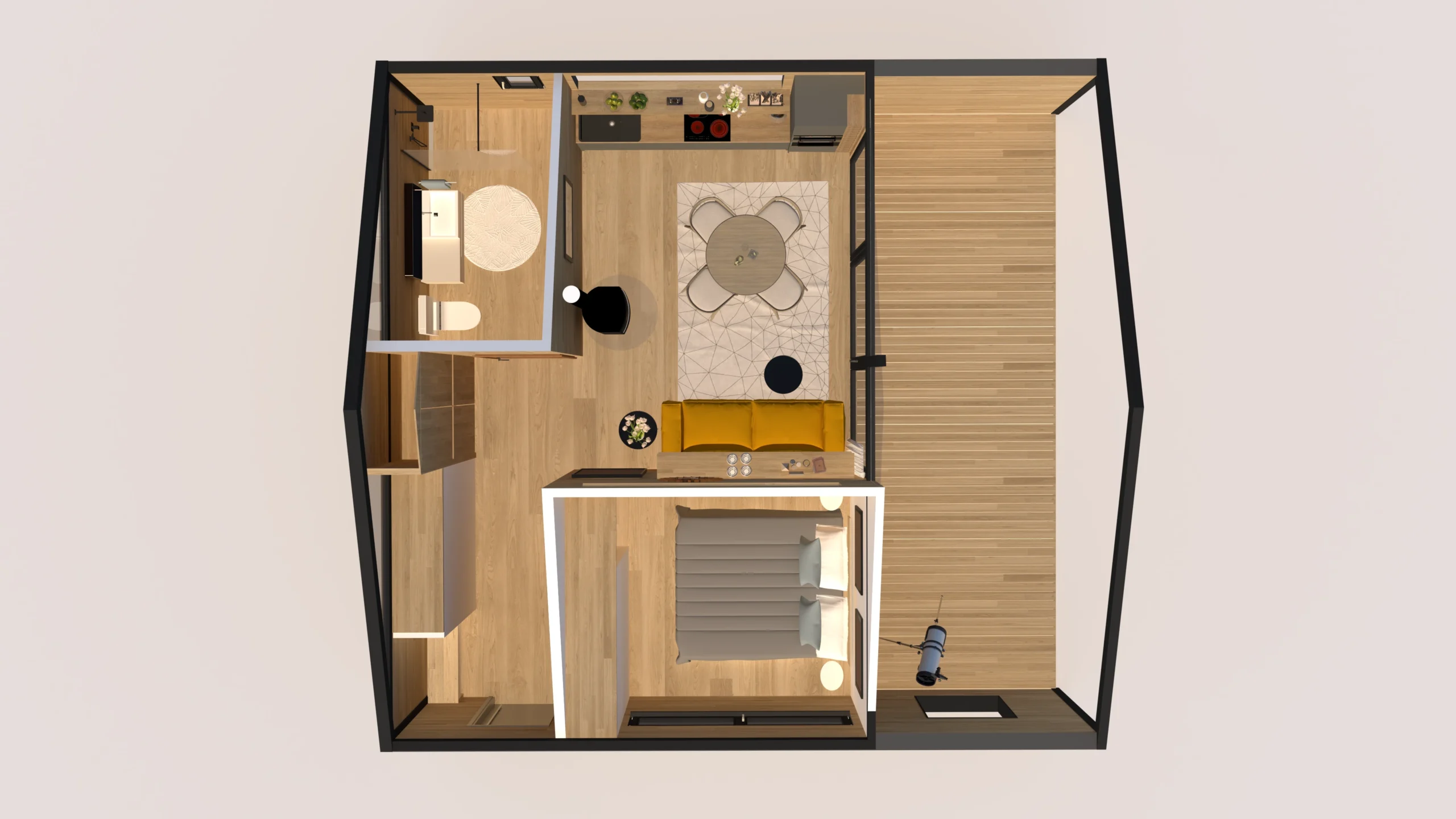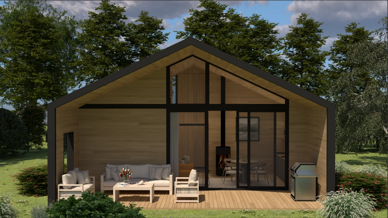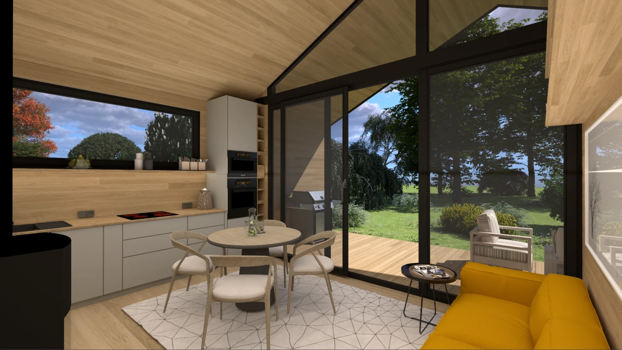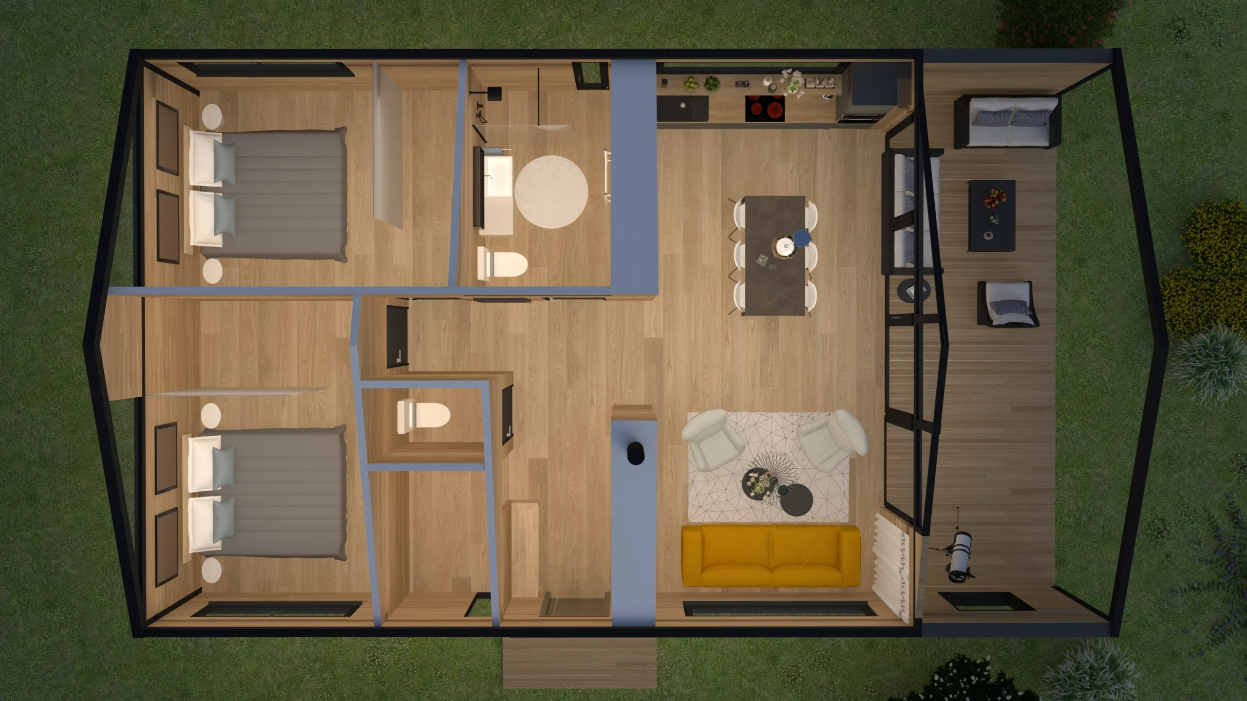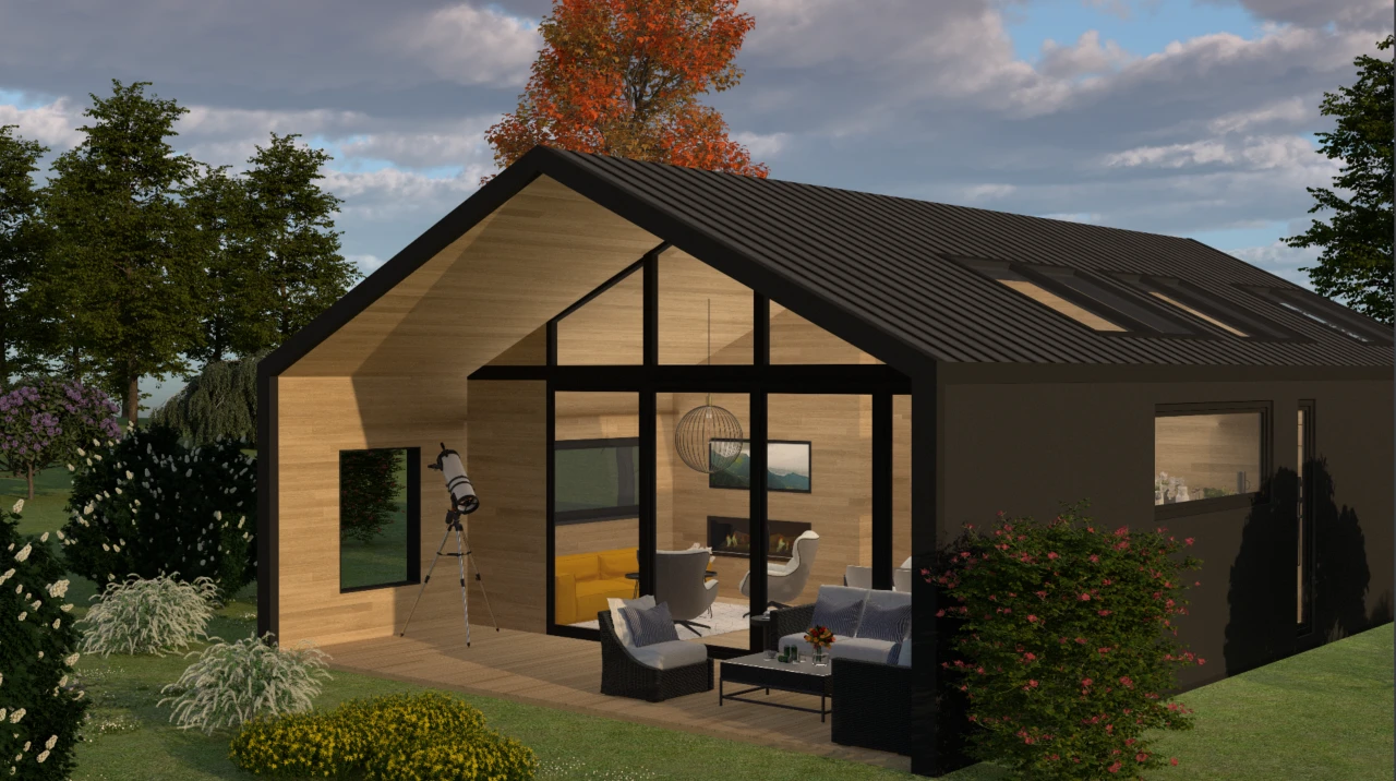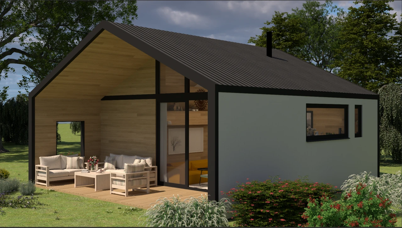 Kompaktní stavba nabízí otevřený obytný prostor s přímým napojením na terasu. Ideální řešení pro klidné a efektivní bydlení.